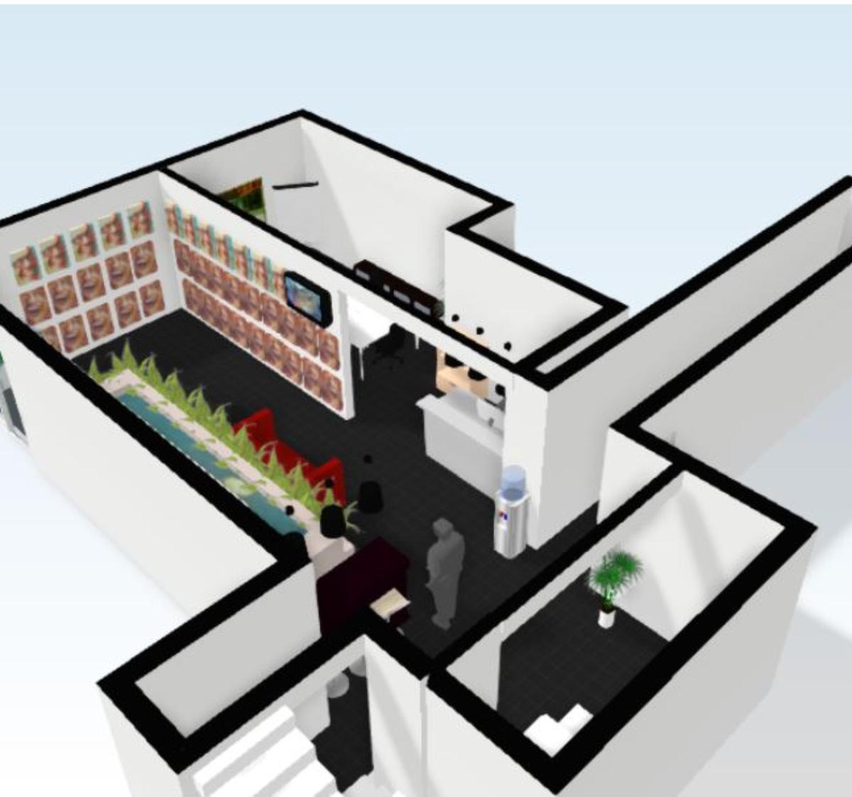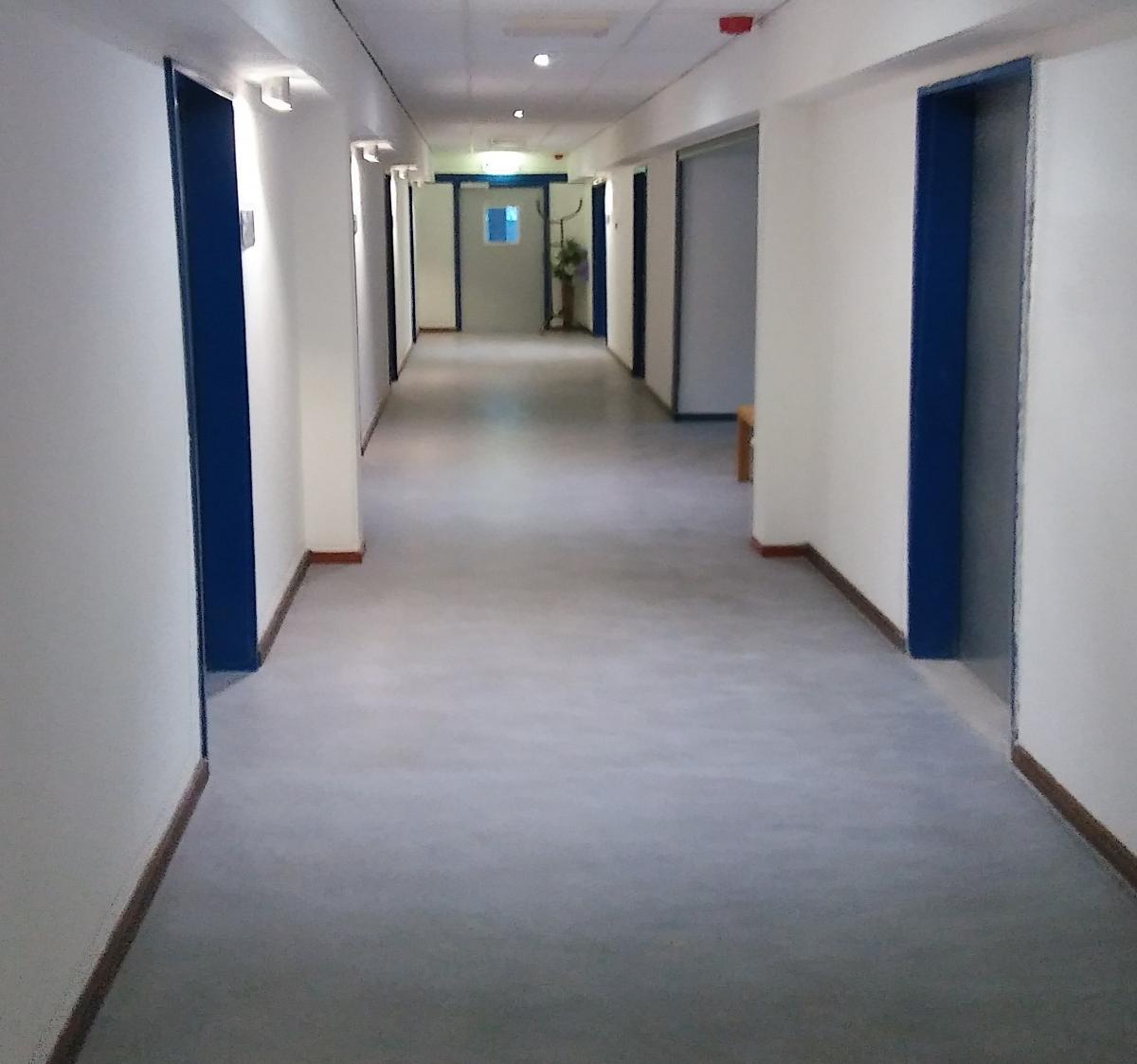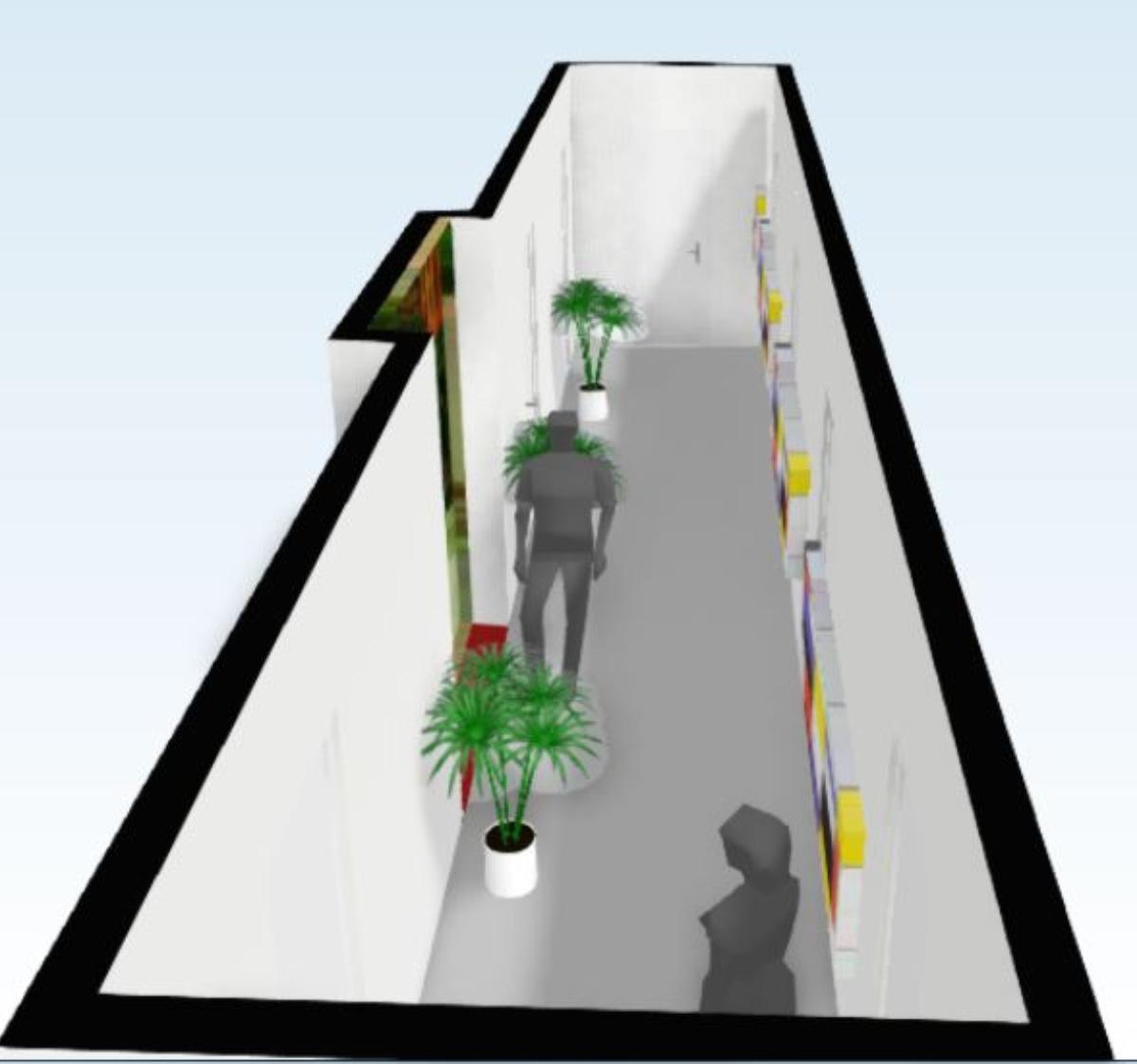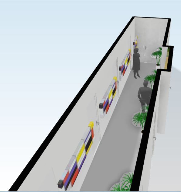 Opdracht; ontvangsthal + gangen Het concept draait om de personalisering betreft presentatie van de ondernemers die gevestigd zijn in het Business Park. De zakelijke beleving die het pand uitstraalt moet vandaag de dag persoonlijker. De ondernemer van nu moet zich kunnen onderscheiden van zijn concurrent. Ook speelt een gunfactor een grote rol in het ondernemersschap. Klanten zijn visueel ingesteld, dus door te laten zien wat een bedrijf doet, wie er achter een produkt of dienst zit, zorg je ervoor dat de klant de juiste beleving krijgt. Dit kan zijn d.m.v. een foto, logo, productomschrijving etc. Het concept is dat alle bedrijven een eigen foto, tekst e/o logo kunnen (laten) maken. Denkend aan gedrukt op plexiglas, aluminium of fotolijsten die makkelijk weer te verwisselen zijn. De grootte van de afbeelding kan afhankelijk zijn van, of het vaste huurders van een ruimte zijn of flexibele. (bv. 50x50cm of op zo'n zelfde plaats passen ook 4 afbeeldingen van 20x20cm) Optie: kamernummer rechtsboven in de hoek. Zo wordt het in één oogopslag (beeldend) duidelijk wat voor ondernemers (+product of dienst) er in het pand gevestigd zijn en waar ze te vinden zijn. Verder komt de ruimte koel en zakelijk over. Dat beeld klopt natuurlijk prima bij een businesscentrum, maar mag wel wat aangepast worden aan deze tijd. Zoals warmere kleuren, materialen en wat meer groen. Het oogt hierdoor ook wat persoonlijker. Tevens beïnvloeden kleuren,materialen, verlichting, muziek maar ook extra service en aandacht de gemoedstoestand van de klant en zal dus ook invloed hebben op de omzet van de ondernemers. De gangen zijn lang, smal en zakelijk. Er ligt grijs linoleum op de vloer en de deuren+deurposten zijn Kobaltblauw. Dit is een gegeven en kan wegens eventuele overlast voor de huurders van de kantoren niet worden vervangen. Er is gekozen om de kobaltblauwe kleur terug te laten komen in de kunst welke over de gehele linker muur wordt bevestigd. Het kunstwerk is ter grootte van de gehele muur en ong. 0.75cm hoog en zal zorgen voor warmte, kleur en een juiste acoustic. Deze zal onderbroken worden door de deuren. Aan de rechterkant zullen planten komen en een zitje waar ondernemers samen een kopje koffie kunnen drinken.