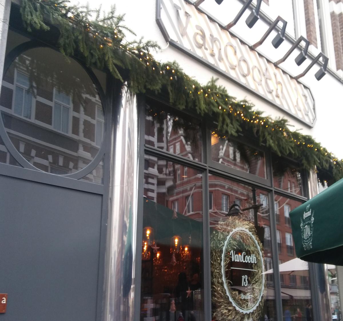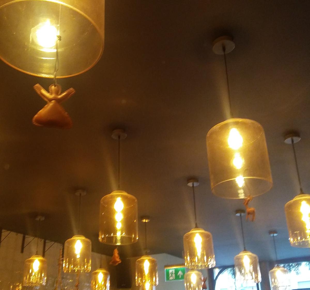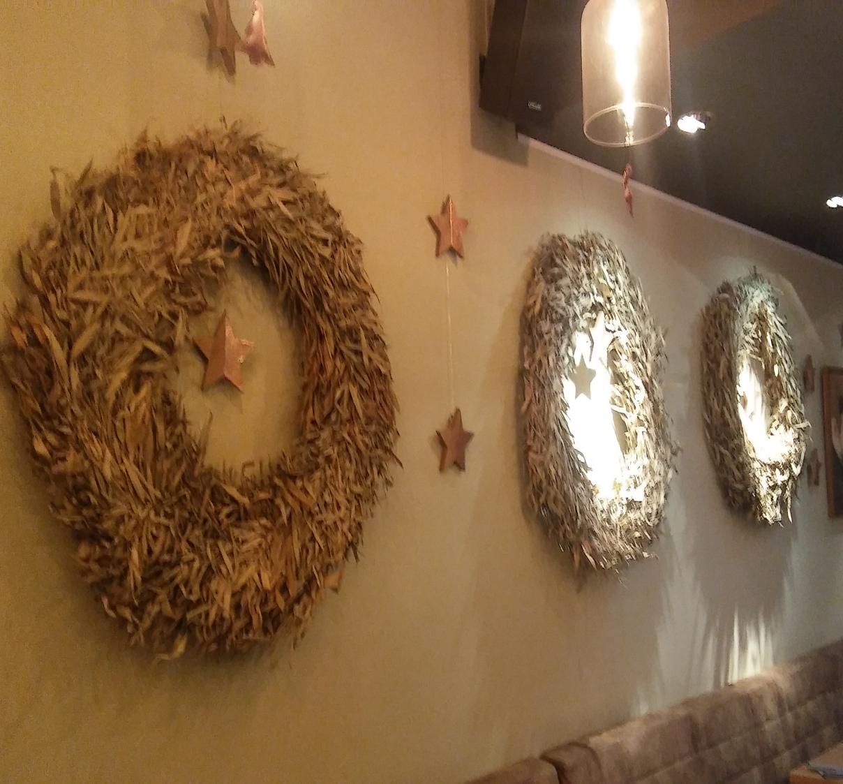 December 2016 Opdracht: restaurant van Cooth 13 in kerstsfeer. De eigenaar wil wel kerstsfeer maar minimaal/ sober en passend bij het restaurant en doelgroep. Er is gekozen voor 4 grote kransen van gedroogd bamboeblad. 3 links achter op de wand en 1 voor het raam van de pui. Verder om de kerstsfeer af te stemmen op de doelgroep van het hamburger restaurant, is er gekozen om aan alle lampen, in de kransen en voor het raam hangers van stoer leer te hangen in de vormen engeltjes, kerstboompjes, sterren en rendieren. Buiten aan de pui, boven het raam en logo, komen groene kerstboomtakken met ledverlichting.